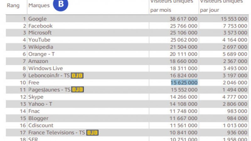 Médiamétrie vient de publier l’audience de l’internet en France pour le mois de novembre 2014. Peu de changement dans le haut du classement où le retrouve les mêmes sites qu’en octobre. Google, Facebook Microsoft occupaient les 3 premières places en novembre. Orange, de son coté, reste le site télécom le plus visité et se classe 6ème. Enfin Free remonte en peu dans le cassement par rapport au mois précédent et passe de la 11ème à la 10ème place. Le domaine free.fr a totalisé 15 625 000 de visiteurs uniques en novembre.