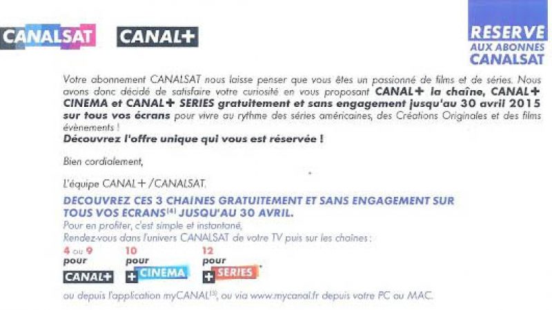 Ainsi que nous l’ont signalé plusieurs Freenautes, Canalsat envoie actuellement un courrier à ses abonnés via Freebox pour leur annoncer la gratuité, jusqu’au 30 avril, de 3 chaînes Canal+ :