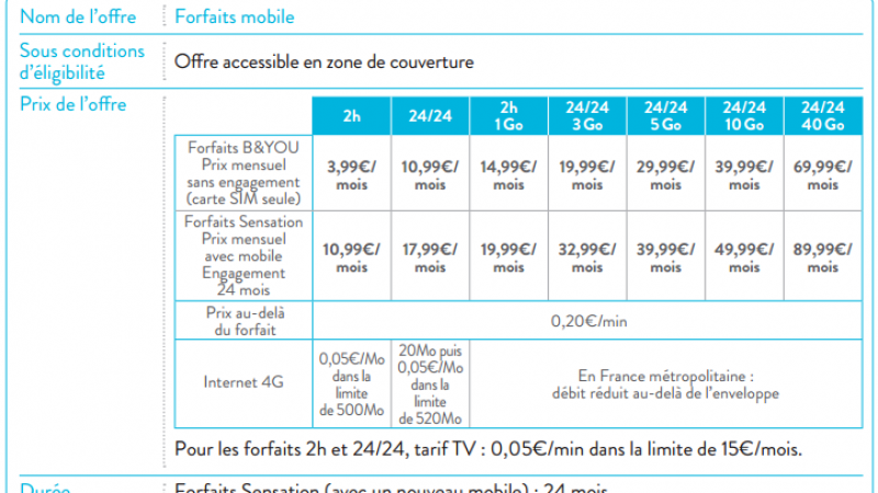 Les tarifs de la gamme « B&You » s’étendent de 3.99€ par mois pour 2h d’appels et les SMS/MMS illimités à 69.99€ par mois pour les appels/SMS/MMS illimités et 40 Go d’Internet Mobile en 3G/4G/4G+ (débit réduit au delà).
