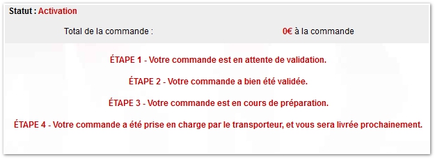 - Etape 4 : Votre commande a été prise en charge par le transporteur, et vous sera livrée prochainement.