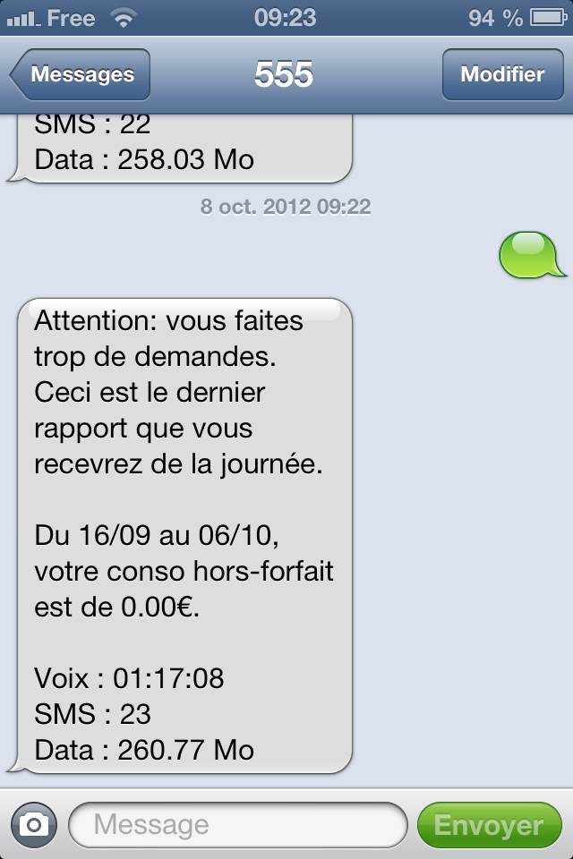 Un abonné Free Mobile, Dimitri, nous rapporte que lorsque trop de demandes au service de suivi conso (en appelant ou envoyant un SMS au 555), un message indique que celui-ci ne sera plus accessible durant la journée. On peut s’étonner de cette limitation, mais on imagine que celle-ci vise à ne pas surcharger le système qui gère ce service, suite à de trop nombreuses requêtes. Il est cependant toujours possible de suivre sa consommation sur l’espace abonné Free Mobile ou de composer le 555 le lendemain.