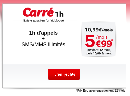 Le forfait Carré 1h et SMS/MMS illimités passe à 5,99 €/mois au lieu de 10,99 €/mois pour un engagement de 12 mois minimum, sans téléphone subventionné.