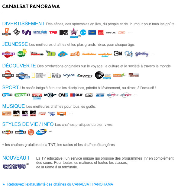 Le premier bouquet est une bonne nouvelle puisqu’il intègre l’ancien Canalsat les Thématiques auquel s’ajoute le pack sport ainsi que le pack famille (sauf les 2 chaînes Disney Cinémagic). Il sera proposé au tarif de 24,90 euros par mois, contre 39,90 euros par mois auparavant pour quasiment les mêmes chaînes. Nommé Canalsat Panorama, ce bouquet propose les chaînes suivantes :