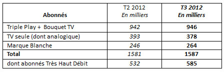 En dehors de ses propres abonnés, Numéricâble publie également ceux des opérateurs en marque blanche sur son réseau, principalement Bouygues Télécom. Le nombre d’abonnés en marque blanche est passé de 246 000 au 2ème trimestre à 264 000 au troisième trimestre, soit un gain de 18 000 abonnés.