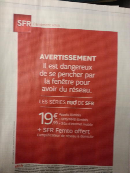 Alors que la série RED, l’offre low cost de SFR, n’a jamais brillé par son audace en termes d’offre et de tarif, elle propose un avantage non négligeable, pour certains, par rapport à Free Mobile : la femtocell offerte (compatible avec la plupart des box dont la Freebox). Cette solution permet de bénéficier du réseau à l’intérieur de son logement. Free avait indiqué que lui aussi les proposerait gratuitement, mais à ce jour, ce n’est toujours pas le cas. C’est ainsi que SFR pointe cet avantage dans une nouvelle publicité diffusée dans la presse.