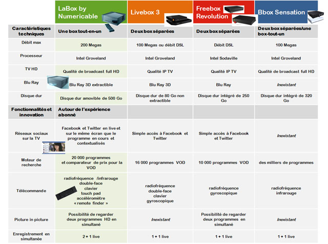Bien sûr, ce tableau est destiné à mettre en avant LaBox de Numéricâble, n’apparaissent donc que les services disponibles sur cette dernière. Il n’est pas non plus fait la distinction entre les services qui sont en option et ceux qui sont inclus, comme le lecteur Blu-ray (inclus avec la Freebox et en option sur les autres box) ou le disque dur qui n’est que de 160 Go par défaut chez Numéricable (les 500 Go sont en option). De plus, le lecteur Blu-ray de la Freebox gère également la 3D.