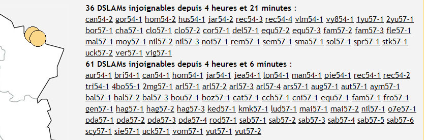 Depuis 4 heures maintenant, tous les Freenautes habitant au nord de la Lorraines sont privés de connexion. Cela concerne 97 DSLAM sur la Moselle (et particulièrement Metz), la Meurthe et Moselle et la Meuse.