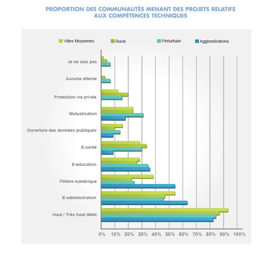 Ces dernières s’estiment laissées pour compte regard du développement des grandes agglomérations. Seule 25% d’entre-elles déclarent être entièrement couvertes en haut-débit. 1/3 affirment que le réseau mobile est accessible sur la totalité de leur territoire et seulement 15 % en réseau 3G.