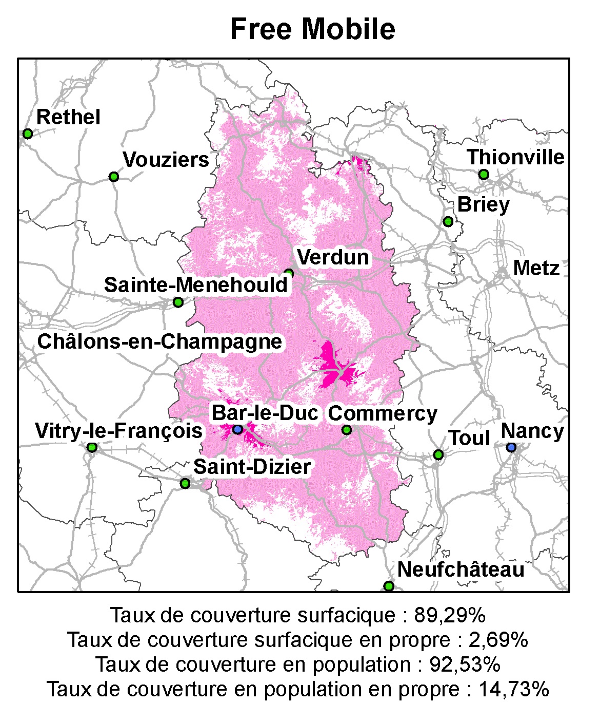 Avec seulement 2,7% de son territoire couvert, la Meuse est la moins bien équipé en antenne Free, seule la ville de Bar Le Duc dispose du réseau Free,le reste du territoire est couvert grâce à l’itinérance d’Orange et de nombreuses zone blanches se dispersent sur le territoire meusien.