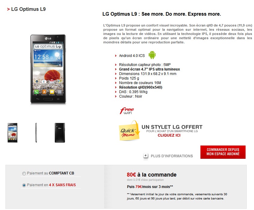 Le LG Optimus L9 fait lui aussi son apparition sur la boutique au prix de 317 € comptant et de 79 € / mois pour un paiement en 4 fois.