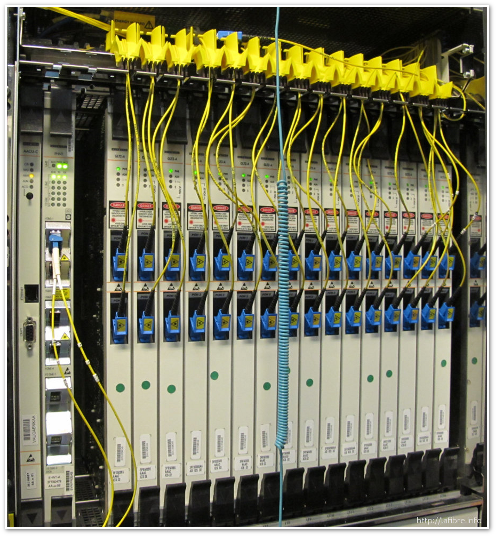 « C’est l’équipement équivalent du DSLAM à la différence qu’une baie remplie d’OLT (3 OLT en face avant et 3 OLT en face arrière) permet d’accueillir 24 000 clients, soit plus que ce que Orange vise sur Clichy et de la moitié de Levallois-Perret. Ce sont des OLT de première génération. Les derniers OLT permettent de mettre 16 384 clients sur un même équipement, soit 98304 par baie ».
