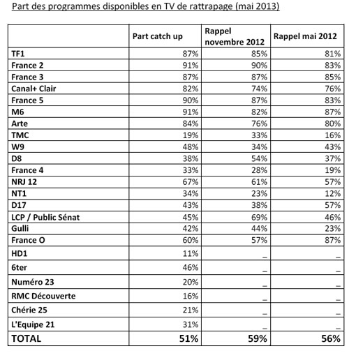 D’après l’étude réalisée pour le CNC par www.tv-replay.fr au mois de mai 2013, la part des programmes disponibles en replay dans les grilles des chaînes historiques continue de progresser. En tête de ce classement France 2 et M6 (ex-aequo avec 91% de programmes diffusés entre 17h et minuit proposés en TV de rattrapage), suivies de France 5(90%). TF1 et France 3 se placent en troisième position avec 87%.
