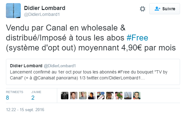 Pour le moment, le contenu exact de l’accord avec Free n’est pas connu, mais il s’agira, comme pour Orange, de proposer des chaînes du groupe Canal+ aux Freenautes. Et des rumeurs se font déjà entendre sur la forme que prendrait ce partenariat. Selon @DidierLombard1 (qui n’est pas le compte officiel de l’ancien PDG d’Orange), il s’agirait d’inclure une offre « TV by Canal », qui intégrerait le chaînes actuelles de Canalsat Panorama, pour un tarif de 4,90€ (un bouquet qui coûte actuellement 24,90€). Les chaînes seraient vendues en gros à Free par Canal, et c’est Free qui se chargerait de la distribution. Bien sûr, si un tel tarif peut être pratiqué, c’est que Free se serait « engagé » sur la vente de nombreux abonnements, qui peuvent se compter en millions.