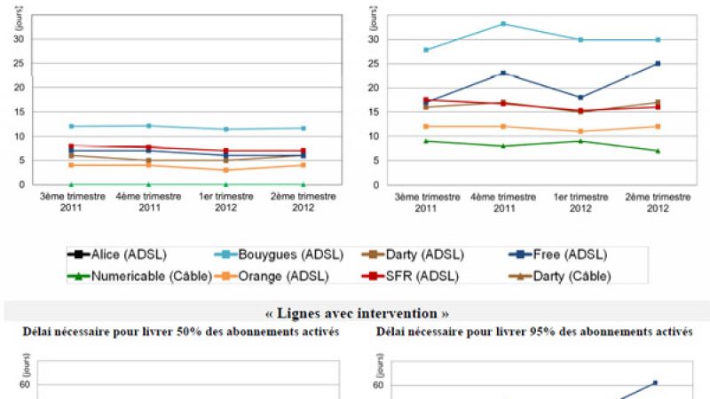 L’ARCEP a publié les résultats des indicateurs de qualité de service du téléphone fixe au 2ème trimestre 2012. L’occasion de faire un comparatif entre les différents opérateurs. Comme on le constate sur les graphiques ci-dessous, Free se trouve dans la moyenne basse en ce qui concerne les délais d’ouverture d’une ligne. Concernant le tau de panne, Free se situe dans la moyenne des opérateurs.