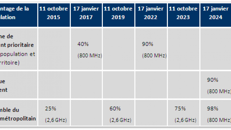 Dans la bande de fréquence 800 MHz, 40 % des zones de déploiement prioritaire seront couvertes, avant le 17 janvier 2017 (90% en 2022). Le 800 MHz couvrira quasiment l’ensemble du territoire en 2027 (99,6%).