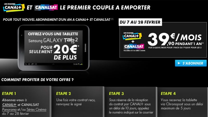 Une nouvelle offre promotionnelle Canal+/Canalsat est disponible depuis le 7 février. Pour tout nouvel abonnement (toute personne non abonnée au cours des six derniers mois) d’un an souscrit simultanément aux Chaînes CANAL+ et à CANALSAT Panorama et/ou Séries Cinéma, une Tablette Samsung Galaxy Tab™ 2 7.0 (Wi-Fi) 8GB vous sera proposée pour 20 euros de plus. Cette offre est limitée à 2000 tablettes et jusqu’au 28 février.