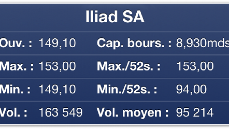 Le titre du groupe Iliad, maison-mère de Free, connait actuellement une nette augmentation sur les places financières. Il atteint plus de 152 euros, en hausse de 2,83% (153 euros en séance). L’action du Groupe explose ainsi un nouveau sommet historique. Le titre s’était envolé à 151,7€ lors de la publication du chiffre d’affaires, le 28 février dernier. Le groupe Iliad est quasiment valorisé 9 milliards d’euros (8,930 milliards).