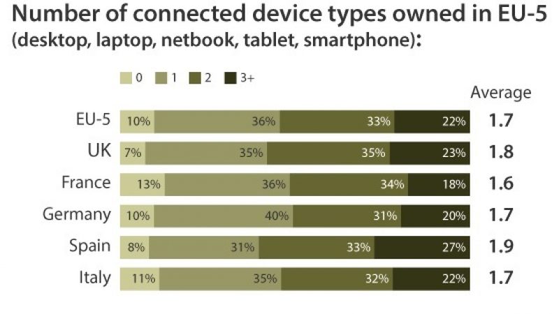 D’après une étude menée d’avril à juin 2012 auprès de 22 662 personnes de France, Allemagne, Italie, Pays Bas, Espagne, Suède et Royaume Uni, de 16 ans et plus, les Français sont les moins bien équipés en appareil connectés.