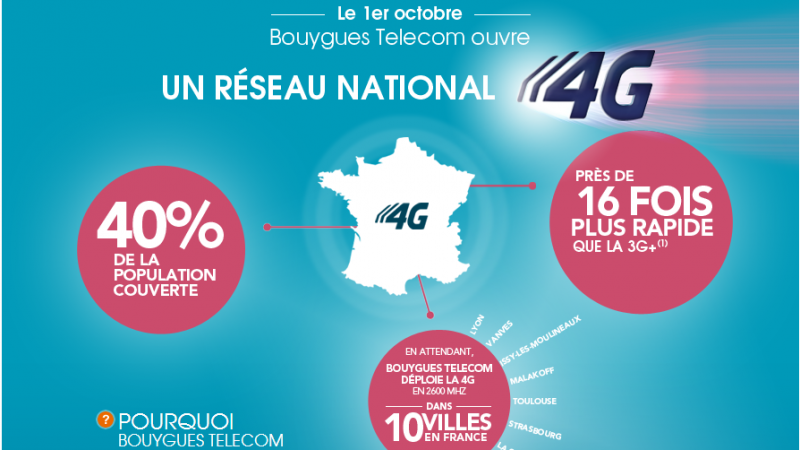 Un premier lancement sur la bande 2600 Mhz auquel s’ajoutera, dès le 1er octobre 2013, l’ouverture de la bande 1800 Mhz qui permettrait, selon Bouygues Télécom, de lui garantir 40 % de la population en 4G