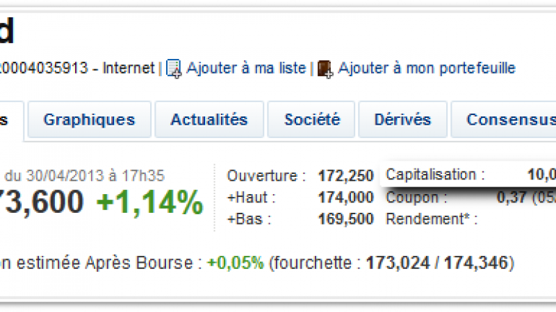 Aujourd’hui, le groupe Iliad a franchi un nouveau cap. La maison-mère de Free et Free Mobile pèse désormais plus de 10,01 milliards d’euros. Cette performance fait suite à la forte augmentation de l’action du Groupe depuis le lancement de Free Mobile. Le titre Iliad a bondi de 79,6% en un an, et plus de 129% en trois ans (l’action valait à peine 62 euros). Une nouvelle fois, ce mardi 30 avril, l’action d’Iliad a explosé son précédent record en atteignant 173,60 euros (+1,14%). L’action a atteint 174 euros au plus haut en séance.