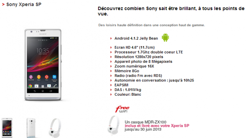 Un nouveau Smartphone fait son entrée sur la boutique de vente en ligne Free Mobile. Le Sony Xperia SP, sous Android 4.1.2 Jelly Bean rejoint le Samsung Galaxy S4 dans la gamme des téléphones compatibles 4G sur la bande des 2,6 GHz.