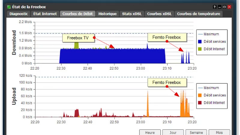 Depuis la mise à jour 2.0.0 déployée pour le Freebox Server et la mise à disposition de Freebox OS, Free permet aux abonnés de différencier la bande passante utilisée par Internet d’une part, et par les différents services d’autre part (notamment Freebox TV ou les Femto Freebox). Pour connaître, en temps réel, la bande passante utilisée par les services, il vous suffit de visualiser la courbe « Débit Services » dans l’interface Freebox OS : « Etat de la Freebox » puis « Courbes de Débit ». N’oubliez pas d’éteindre Freebox TV pour connaitre le débit utilisée uniquement par la Femto. Dans le cas contraire, la Femto utilisera le débit "résiduel".