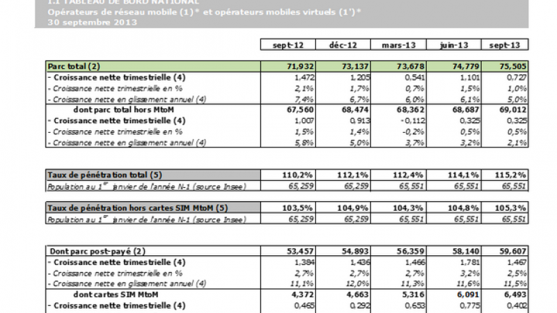 L’ARCEP vient de publier son observatoire trimestriel des services mobiles au 3 ème trimestre 2013. Au 30 septembre 2013, le nombre de cartes SIM en service atteint 75,5 millions, en croissance de 727 000 par rapport au trimestre précédent et de 3,6 millions sur un an.