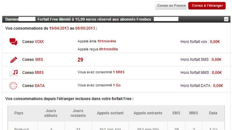 Afin de savoir si les 35 jours ont déjà été utilisés, et quelle a été la consommation lorsque l’abonné se trouve dans les Antilles ou en Guyane, Free ajoute un nouveau tableau spécifique dans le suivi conso de l’interface abonné. Voici comment cela se présente pour le « Pass Destination Portugal »