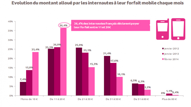 Médiamétrie note que les abonnements 4G supérieurs à 30 € constituent "un frein à l’abonnement." Depuis l’arrivée de Free Mobile, la proportion de Français qui paient leur abonnement moins de 20 € est passée de 33 en janvier 2012 à 60 % en février 2014.