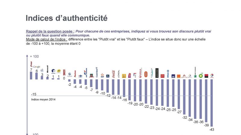 Il est ensuite calculé un indice pour chaque entreprise, qui affiche la différence entre les "Plutôt vrai" et les "Plutôt faux" (L’indice se situe donc sur une échelle de -100 à +100, la moyenne étant 0.). Et c’est donc Free qui se place en première position, avec un indice de 7. Seules 6 entreprises se retrouvent avec un solde positif d’opinions favorables. Si les premières places sont occupées par des entreprises des nouvelles technologies, Free est le seul opérateur télécom dans le haut de classement, SFR obtenant un indice de -24 et Orange de -27.