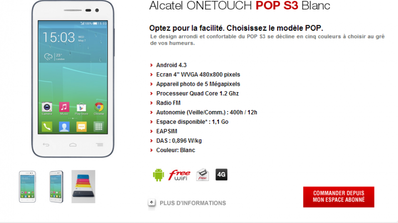 Un nouveau terminal fait son apparition sur la plateforme de vente en ligne Free Mobile. Il s’agit du Alcatel One Touch Pop S3. Vendu 139 €, il s’agit du téléphone 4G le moins cher du moment sur la plateforme. Si de nombreux téléphones 4G ne sont que de catégorie 3 et sont plafonnés à 100 Mbits en réception, celui-ci malgré son bas prix peut atteindre théoriquement les 150 Mbits.