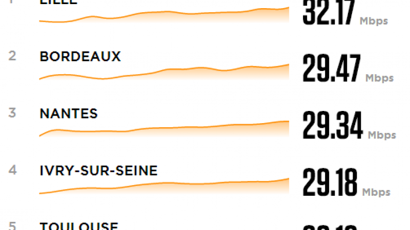 Selon les données de Ookla, le débit mobile descendant moyen en France est de 16,2 Mbits quand dans le monde il n’atteint que 8,7 Mbits. Les données compilées ne différencient pas la technologie utilisée s’il s’agit de la 3G, 3G+ ou de la 4G. Du côté des villes où l’on retrouve les meilleurs débits mobiles tout opérateur confondu, Lille atteint des débits moyens descendants de 32,17 Mbits devant Bordeaux, Nantes et Ivry sur Seine.