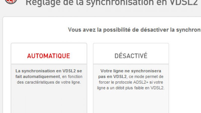 Free vient d’ajouter une nouvelle rubrique sur l’interface abonné Freebox qui permet de gérer la synchronisation en VDSL2. Depuis la rubrique Freebox, sélectionnez « gestion de la synchronisation en VDSL 2 ». Il est alors possible de laisser la synchronisation en VDSL 2 se faire automatiquement, en fonction de la qualité de la ligne, ou bien de forcer la synchronisation en ADSL 2+. En effet, pour certains abonnés, le passage en VDSL 2 a fait fortement chuté leur débit. Cette nouvelle option va donc régler le problème en repassant en ADSL 2+.