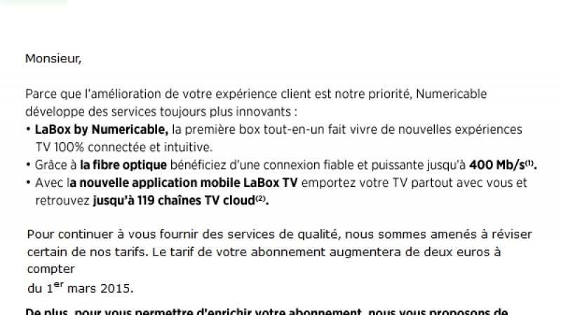 Numéricable ne sera pas en reste puisque ses tarifs vont augmenter de 2 euros par mois à compter du 1er mars 2015. Le cablo-opérateur envoie à cet effet un courrier annonçant cette hausse aux abonnés concernés :