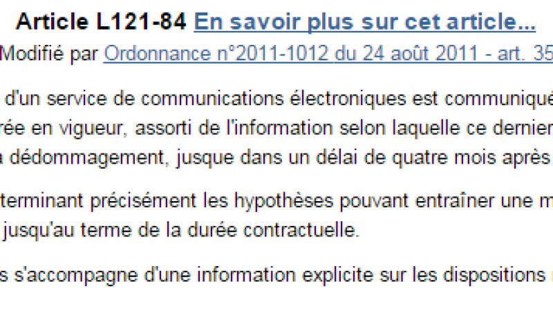 Cette possibilité est offerte par l’article L121-84 du Code de la consommation, qui décrète que toute modification des conditions du contrat par l’opérateur doit être communiqué au consommateur dans un délai d’au moins un mois avant les modifications ; et que s’il le désire, le dit consommateur peut résilier son contrat sans aucune pénalité, dans un délai allant jusqu’à 4 mois après l’entrée en vigueur de ces nouvelles conditions. Cette possibilité est d’ailleurs indiquée par SFR dans son courrier annonçant la hausse tarifaire à ses abonnés.
