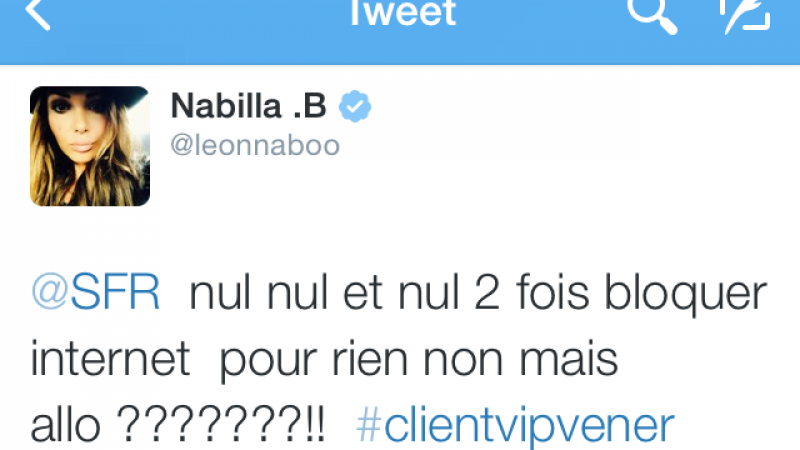 Clin d’oeil : SFR, c’est carrément « nul, nul et nul » selon Nabilla Benattia. Non mais allô quoi ! Sur Twitter, Nabilla voit rouge et pousse un énorme coup de gueule contre l’opérateur. « @SFR nul nul et nul 2 fois bloquer internet pour rien non mais allo ???????!! #clientvipvener ». Et de préciser, « Honteux !!!!! @SFR @SFR_SAV ». Quant au principal intéressé, SFR a répondu, « je vs remercie d’ajouter @SFR_SAV à votre message. Ns restons à votre dispo. Bonne journée ! ». Ce à quoi elle a retorqué : « @SFR_SAV suivez moi je vous explique », avant d’ajouter, « @SFR_SAV bande de voyou ».