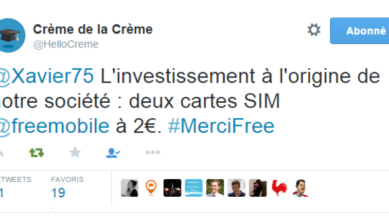 Crème de la Crème : « l’investissement à l’origine de notre société : 2 cartes SIM Free Mobile à 2 euros. Merci Free ».