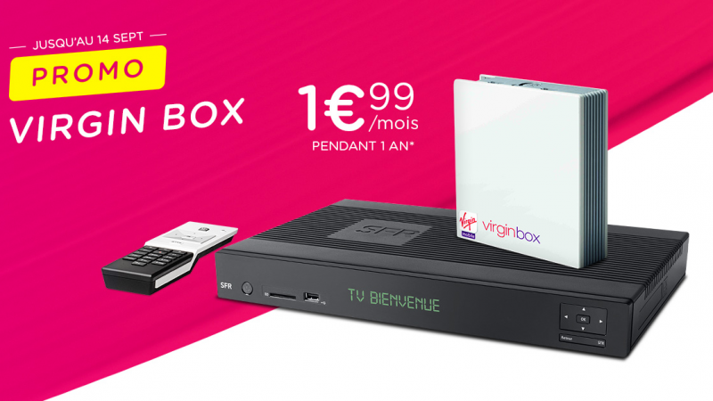 Aujourd’hui, et jusqu’au 14 septembre, c’est Virgin Mobile, une marque de SFR-Numéricâble, qui annonce également sa box à 1,99€/mois durant 12 mois au lieu de 29,99€. Cette fois-ci, l’offre intègre le service de télévision en plus d’Internet et du téléphone