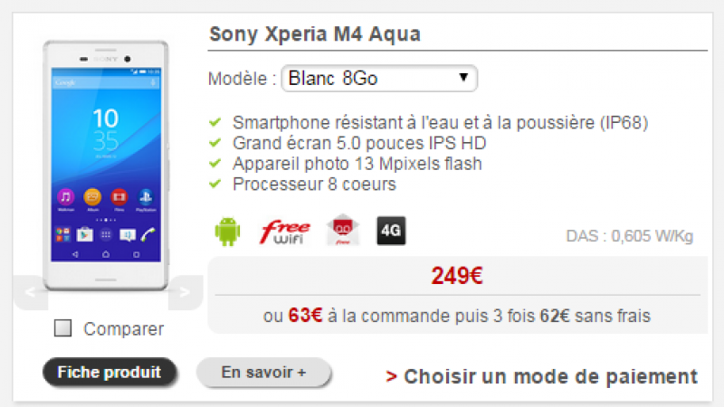 Outre ce petit cadeau, Free a également baissé le prix du Sony Xperia M4 Aqua. Son tarif est passé de 275 euros à 249 euros en paiement comptant (ou en 4 fois sans frais : 63€ à la commande puis 62€/mois pendant 3 mois).