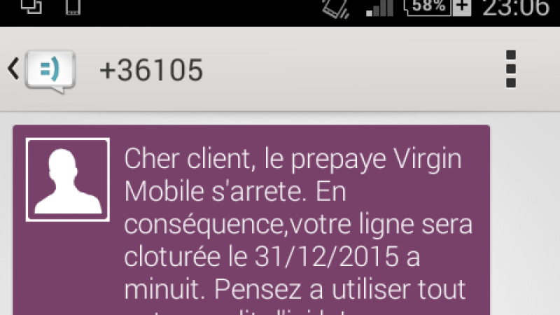 Pour finir l’année en beauté, dès le 31 décembre 2015, les lignes seront tout simplement clôturées. « Cher client, le prépayé Virgin Mobile s’arrête. En conséquence, votre ligne sera clôturée le 31/12/2015 à minuit. Pensez à utiliser tout votre crédit d’ici là », indique le SMS envoyé aux abonnés concernés. Les clients sont désormais orientés vers les offres sans engagement de Virgin Mobile ou les offres prépayées de SFR La Carte.