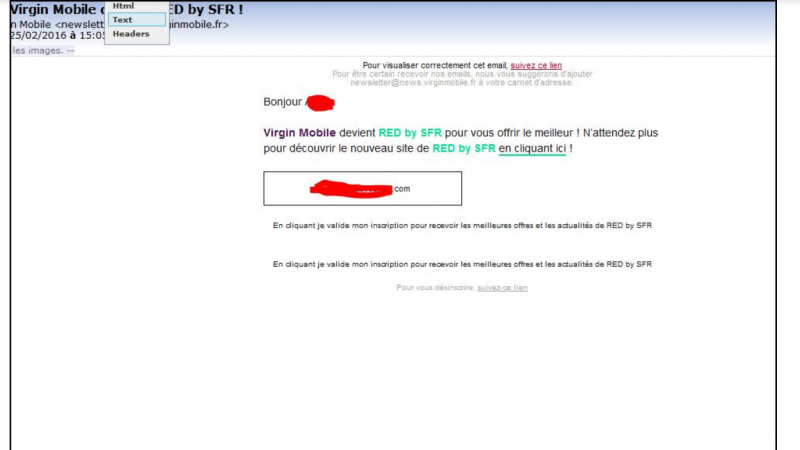 Plusieurs clients de chez Virgin Mobile ont été informés hier, par mail, d’un passage chez RED de SFR en incitant les abonnés à se rendre sur le nouveau site de RED by SFR.