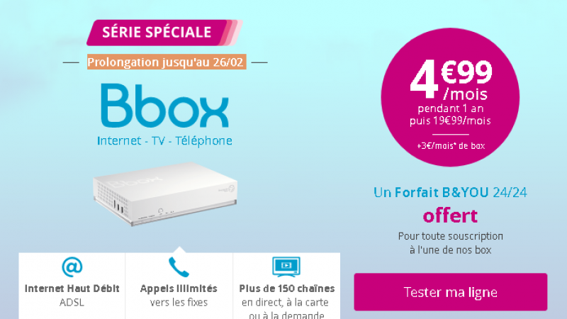 Or, en plus des 4,99€/mois, mis en avant sur le site de Bouygues Télécom ou encore sur les annonces sponsorisées sur Google, il faut ajouter 3€/mois de location de box, soit 7,99€/mois au total, durant la 1ère année. Cela complique donc la comparaison des tarifs chez les différents opérateurs.