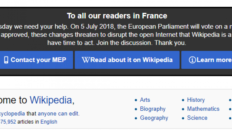 Sur la version anglaise de l’encyclopédie en ligne, un bandeau a été intégré en haut de la page d’accueil qui informe de la date à laquelle le projet doit être voté, le 5 juillet prochain.