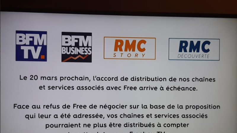 Nous vous le rapportions la semaine, pour pouvoir reprendre ses chaînes gratuites (BFM TV, RMC Découverte, RMC Story et BFM Business), le Groupe Altice réclame 6 millions d’euros à l’opérateur de Xavier Niel. Une somme que Free ne semble pas du tout disposé à donner. A défaut, ces chaînes pourraient disparaître de Freebox TV dès ce mercredi 20 mars.