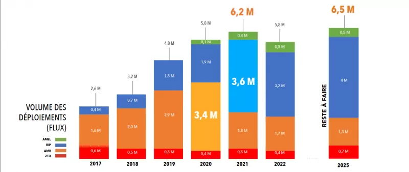 Pour Infranum, 6,5 millions de prises doivent encore être déployées en 2025. Sur ce total, 4 millions de prises concernent justement les RIP, contre 1.3 millions en zone AMII et 0.7 millions de prises en Zone Très Dense (soit les grandes villes et leurs agglomérations). Un demi-million de déploiement devront également être effectués en zone AMEL (Appel à Manifestation d’Engagements Locaux).