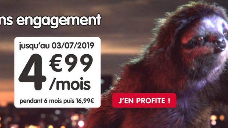 Jusqu’au 3 juillet prochain, NRJ Mobile propose un forfait mobile sans engagement à prix cassé. Pour 4,99 euros/mois, il inclut les appels, SMS et MMS en illimité, ainsi qu’une enveloppe data de 50 Go en 3G/4G. À noter que le tarif promotionnel est valable durant les 6 premiers mois. L’offre prend la forme d’une remise de 12€ par mois pendant les six premiers mois, au-delà, le prix repasse à 16,99 euros.