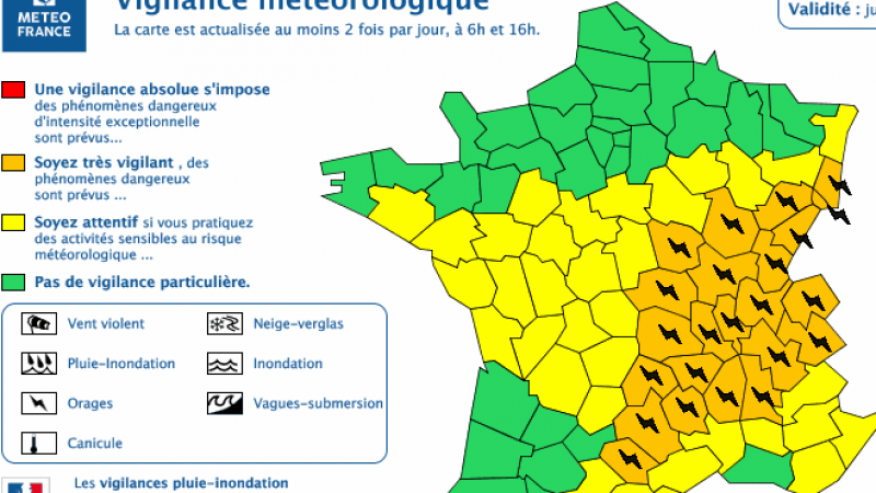 Attention orages ! Si vous habitez dans l’Aveyron (12), Lozère (48) et Tarn (81), Ain (01), Allier (03), Ardèche (07), Cantal (15), Côte-d’Or (21), Doubs (25), Drôme (26), Isère (38), Jura (39), Loire (42), Haute-Loire (43), Nièvre (58), Puy-de-Dôme (63), Haut-Rhin (68), Rhône (69), Haute-Saône (70), Saône-et-Loire (71), Savoie (73), Haute-Savoie (74) et Territoire-de-Belfort (90). Ces 23 départements ont été placés en alerte orange en raison des violents orages prévus, selon la carte de vigilance de Météo-France. L’alerte débute ce samedi à 16h00 et est valable jusqu’à demain dimanche 7 juillet à 16h00