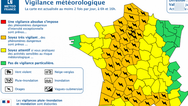 Attention orages ! Si vous habitez dans l’Aisne (02), Aveyron (12), Bouches-du-Rhône (13), Corrèze (19), Eure (27), Gard (30), Hérault (34), Lot (46), Lot-et-Garonne (47), Nord (59), Oise (60), Pas-de-Calais (62), Paris et petite couronne (75-92-93-94), Seine-Maritime (76), Seine-et-Marne (77), Yvelines (78), Somme (80), Tarn (81), Tarn-et-Garonne (82), Vaucluse (84), Essonne (91), Val-d’Oise (95), en Charente (16), Charente-Maritime (17), Cher (18), Dordogne (24), Eure-et-Loir (28), Gironde (33), Indre (36), Indre-et-Loire (37), Landes (40), Loir-et-Cher (41), Loiret (45), Maine-et-Loire (49), Orne (61), Sarthe (72), Deux-Sèvres (79), Vienne (86) et Haute-Vienne (87). pensez à mettre vos Freebox à l’abri des intempéries. Ces 42 départements ont été placés en alerte orange en raison des violents orages prévus, selon la carte de vigilance de Météo-France. L’alerte a été diffusée cet matin et est valable jusqu’à demain mardi 15 octobre à 6h00