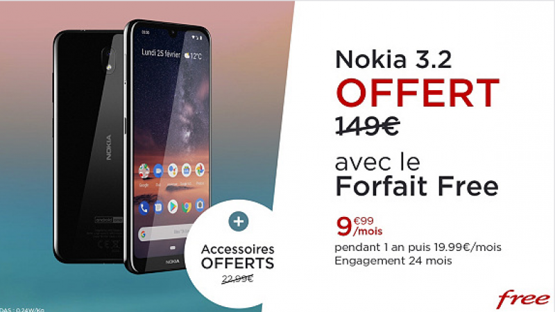Ce forfait Forfait Free Veepee est proposé à 9,99€/mois pendant 1 an, puis 19,99€/mois avec un smartphone Nokia 3.2 16Go offert (d’une valeur de 149€) ainsi qu’un Pack Protection Muvit (valeur 22,99€). L’engagement est de 24 mois et la carte SIM est facturée 10€