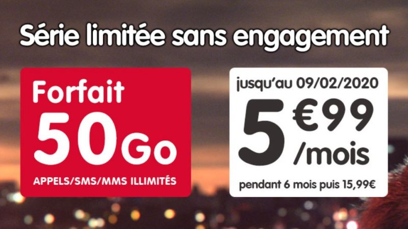 Jusqu’au 9 février prochain prochain, NRJ Mobile propose un forfait mobile sans engagement à prix cassé. Pour 5,99 euros/mois, il inclut les appels, SMS et MMS en illimité, ainsi qu’une enveloppe data de 50 Go en 3G/4G. À noter que le tarif promotionnel est valable durant les 6 premiers mois et que lors de la commande, il faudra compter sur 10€ supplémentaires à payer pour la carte SIM triple découpe. L’offre prend la forme d’une remise de 10€ par mois pendant les six premiers mois, au-delà, le prix repasse à 15,99 euros.